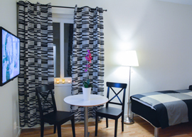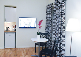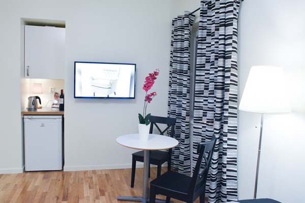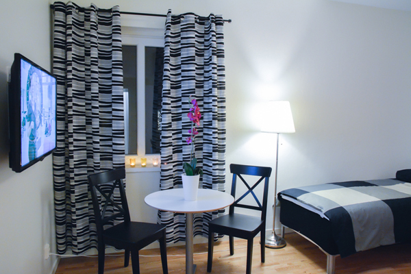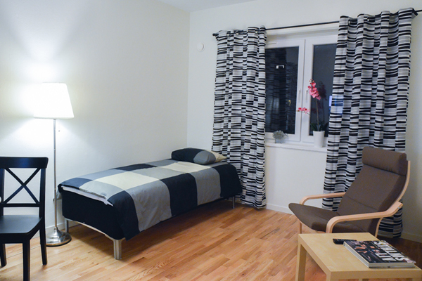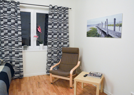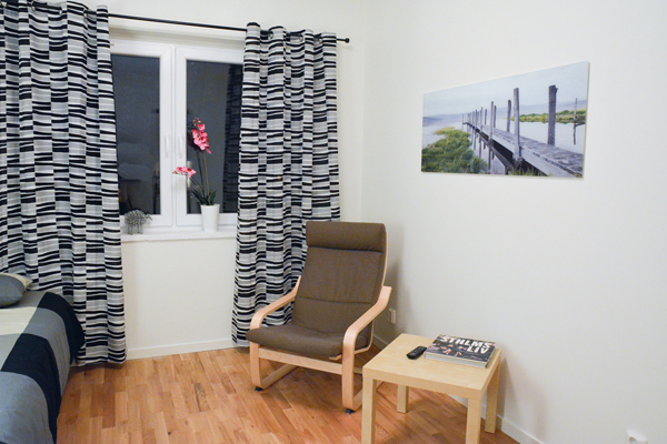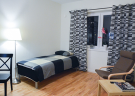 This room have underfloor heating, one bed incl. 5cm bed mattress and mattress cover, wardrobe, armchair, table, 40 inch flat screen televisions with channels 1an, 2an 4an 6an, SvT 24 and Knowledge Channel.